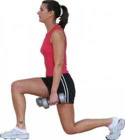 Enseguida, toma aire por la naríz y realiza una zancada hacia adelante sin doblar o arquear la espalda y sin despegar el otro pie del suelo, hasta que el muslo quede completamente horizontal. Regresa a la posición inicial.